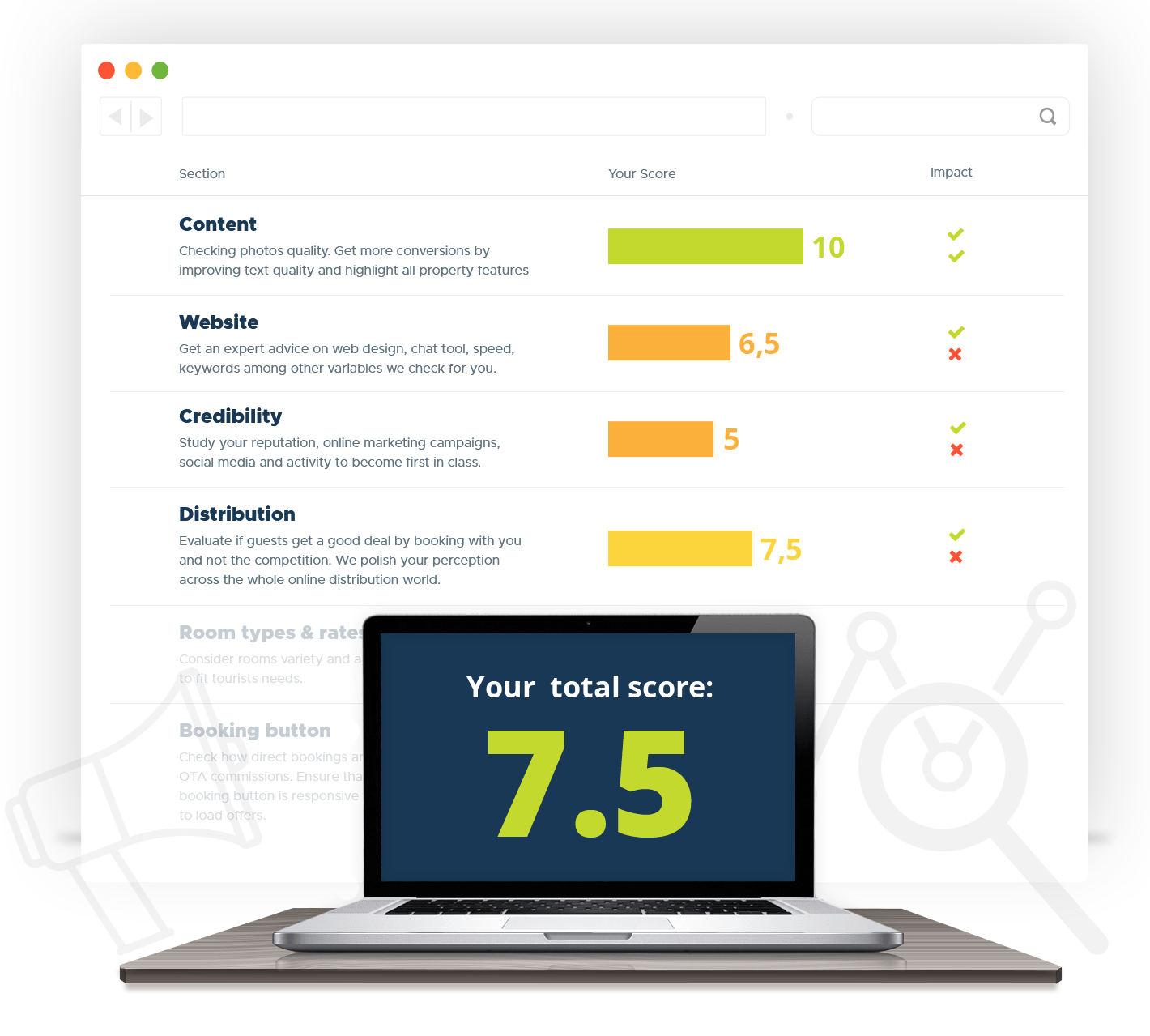 Get your personalized free Online Analysis, also called Online Health Check. Our experts will assess strong points and weaknesses, discover opportunities and threats to optimize your property to the full.